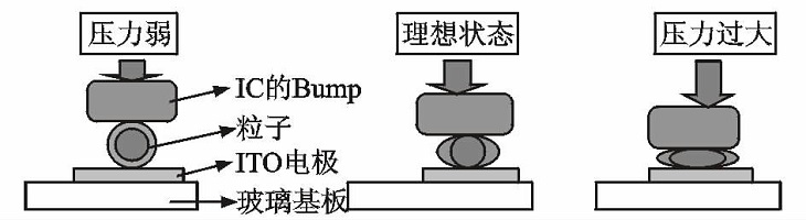 1、壓力控制,由于綁定壓力大小直接決定了ACF粒子的破碎程度,從而決定了產品的合格率,因此綁定過程中對綁定壓力的精密控制至關重要,GZC-MY200脈沖熱壓機采用是精密調壓閥來控制綁定壓力。如圖所示?,當綁定壓力過小時,無法實現ACF導電粒子的合理破碎,從而導致縱向電氣無法導通,而當綁定壓力過大時,ACF粒子將會被壓的過于破碎,也無法實現縱向電氣導通,橫向電氣絕緣效果也差?。?
