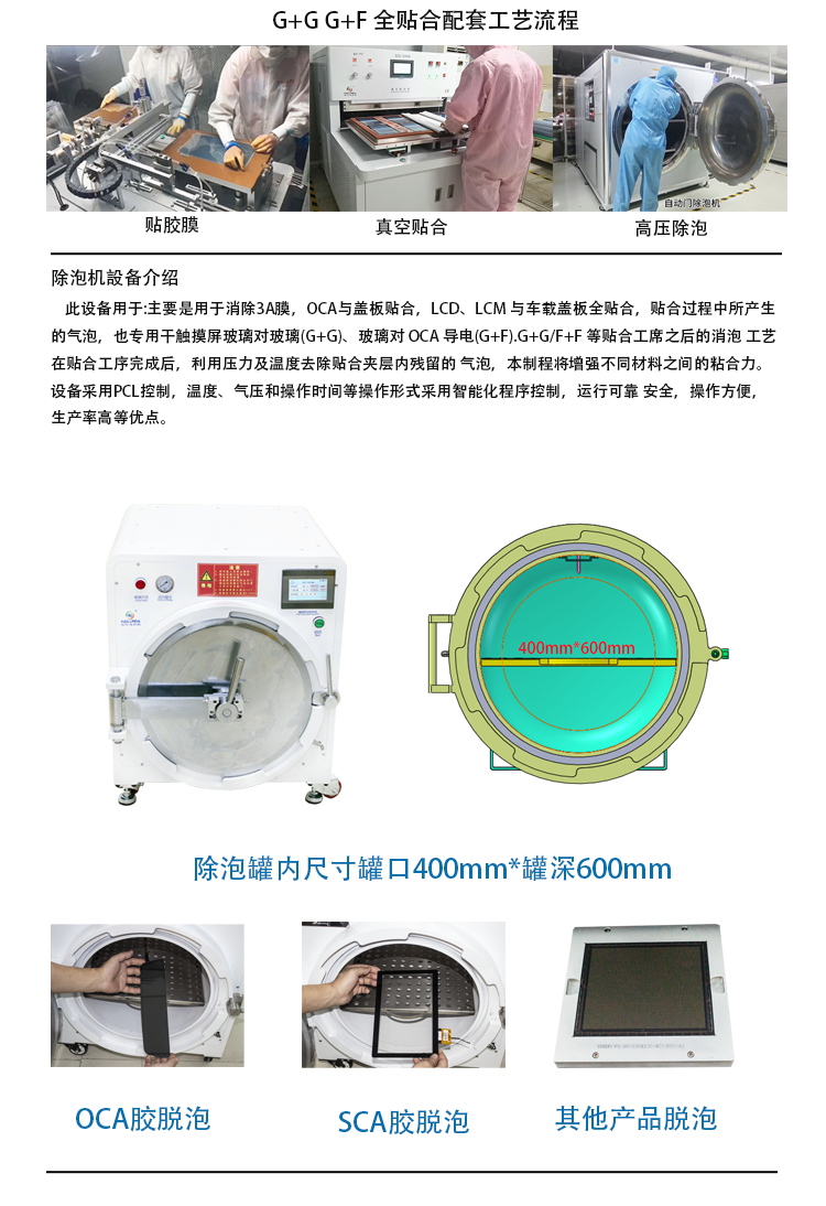 本設(shè)備適合硬對(duì)硬貼合(CG 貼合)或總成(CTP+LCD)工序后對(duì)其脫泡的工序